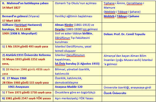 Örneğin, II. Mahmud’un Mart 1827’de Osmanlı Tıp Okulunu açmasından bugüne dek, 200 yıldır uygulamaya giren üniversite yasaları, Cumhuriyet döneminde 6 kez değişmiştir: 1924, 1933, 1946, 1960, 1973, 1981 (Tablo I).